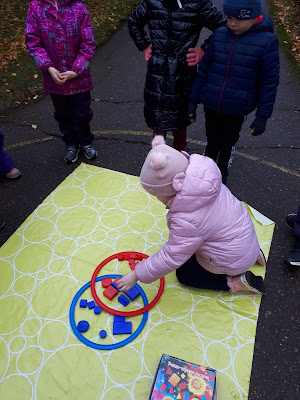 -вся прогулка на улице была в обучающих играх: дети понимают разницу и знают движения при словах : день/ночь, знакомы с понятием комплемент, учились говорить друг другу приятные слова; почти все находят цифру в числовом ряду, выполняя задание: перепрыгнуть заданные цифры, выложив числовой ряд;